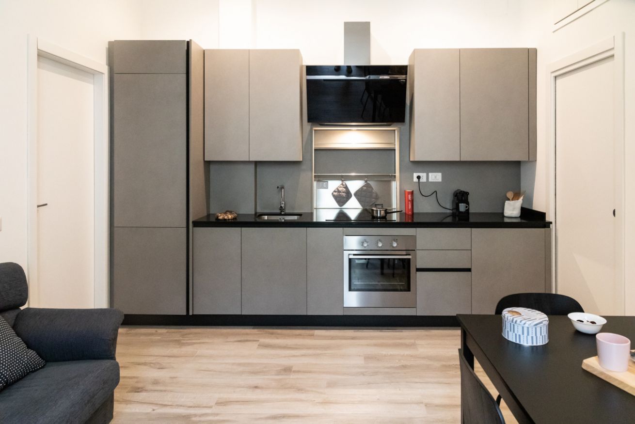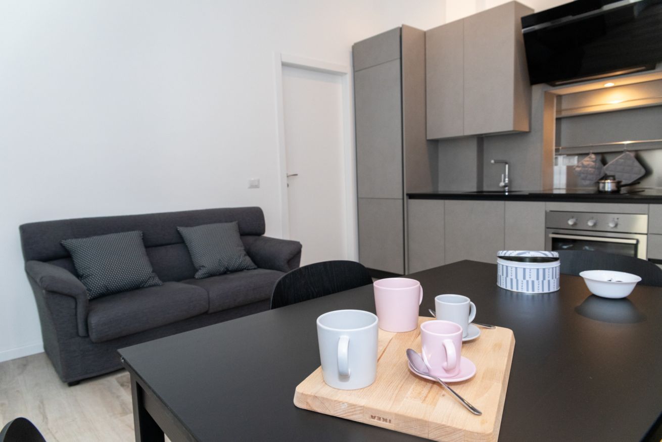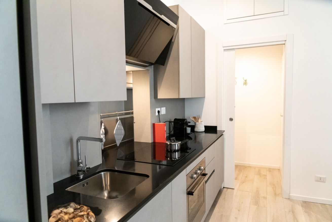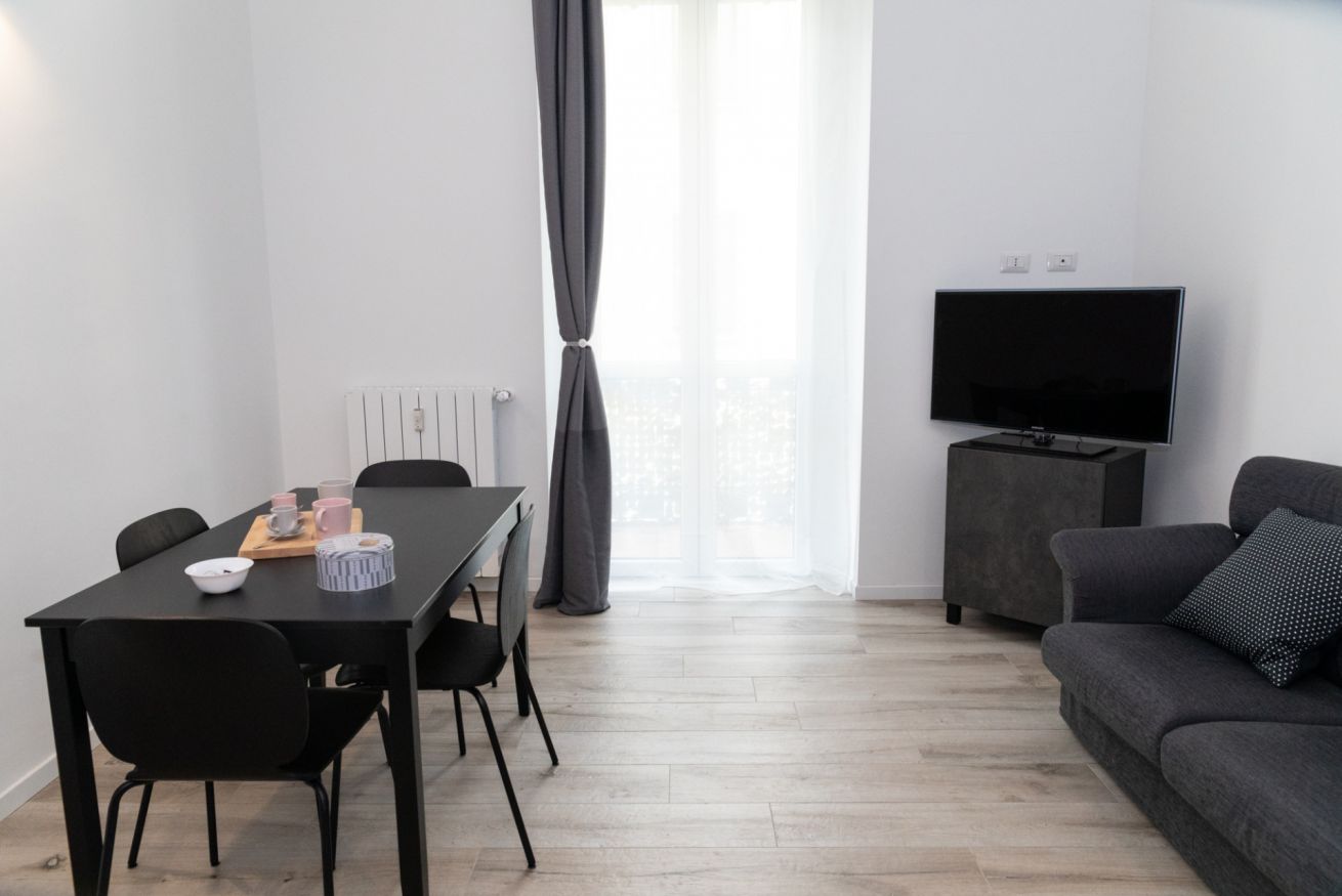 Questo bilocale situato proprio nel cuore della zona di Loreto è perfetto per chi ama un ambiente minimal chic, dove tutto è pensato per rilassare l'occhio di chi entra e vuole sentirsi subito a casa. I colori infatti sono tutti declinati sul bianco, il grigio e il nero, senza eccessi cromatici o abbondanza di oggetti: c'è tutto il necessario per un soggiorno piacevole e rilassante.