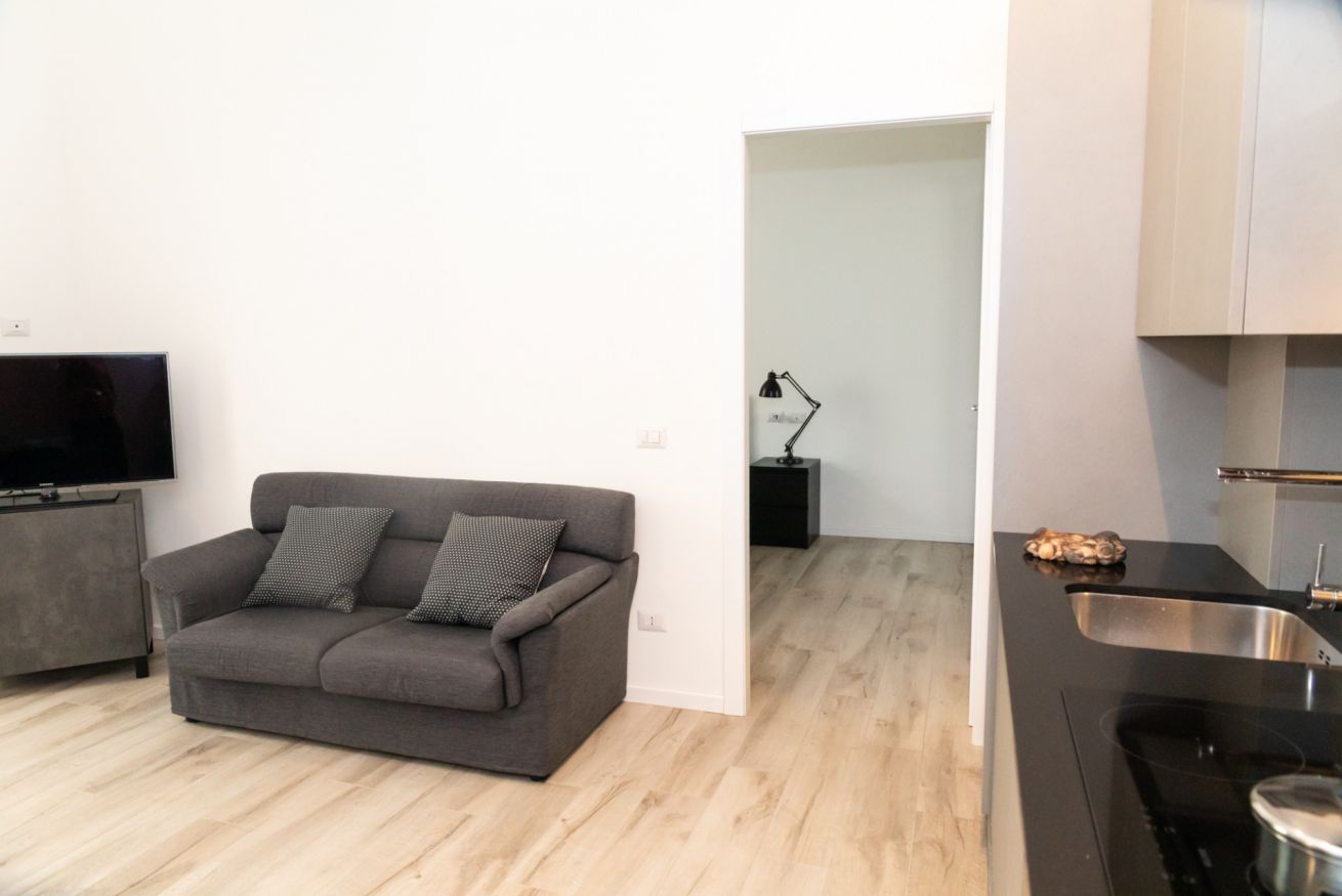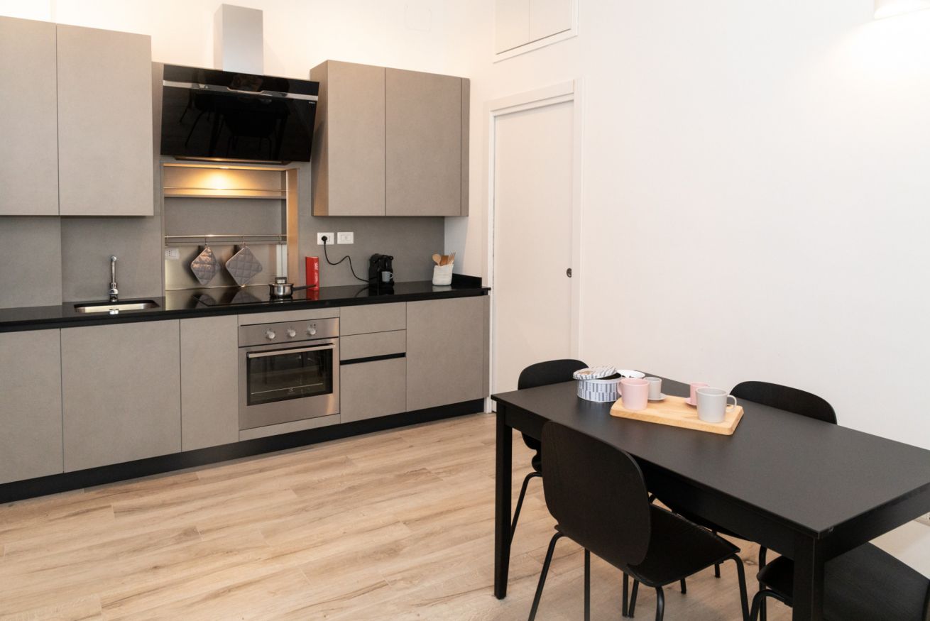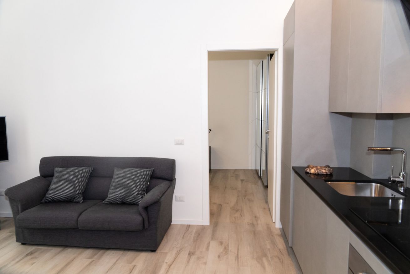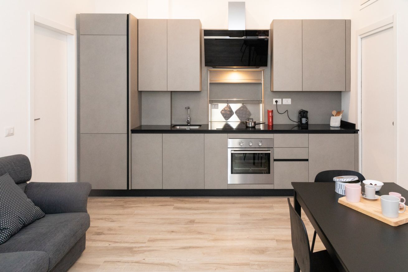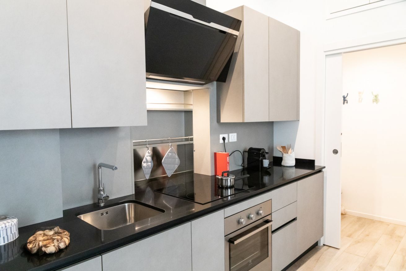 Questo bilocale situato proprio nel cuore della zona di Loreto è perfetto per chi ama un ambiente minimal chic, dove tutto è pensato per rilassare l'occhio di chi entra e vuole sentirsi subito a casa. I colori infatti sono tutti declinati sul bianco, il grigio e il nero, senza eccessi cromatici o abbondanza di oggetti: c'è tutto il necessario per un soggiorno piacevole e rilassante.