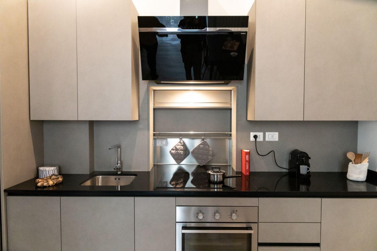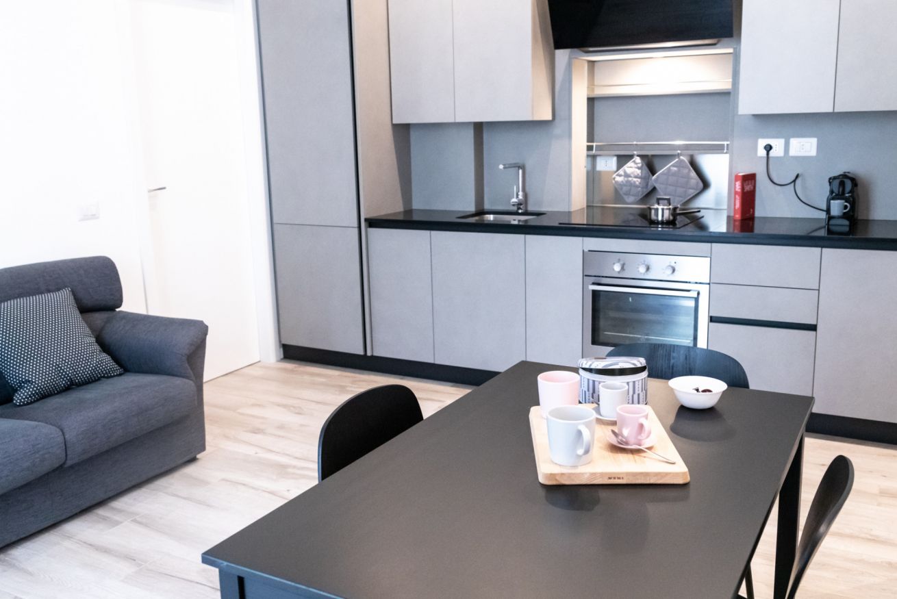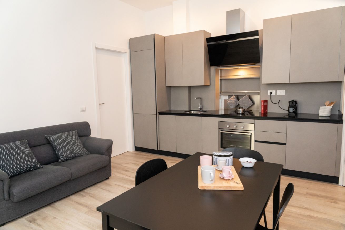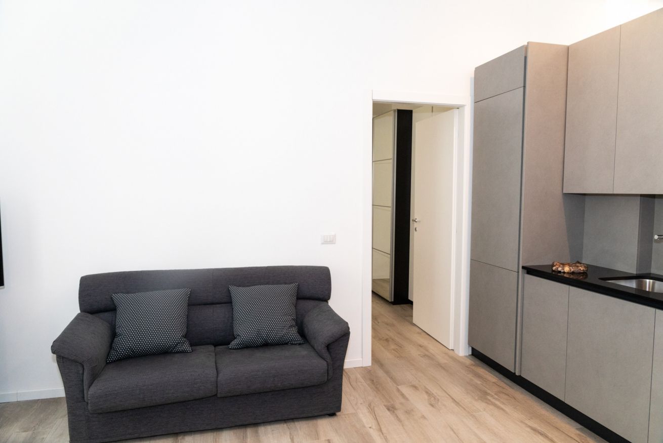 Questo bilocale situato proprio nel cuore della zona di Loreto è perfetto per chi ama un ambiente minimal chic, dove tutto è pensato per rilassare l'occhio di chi entra e vuole sentirsi subito a casa. I colori infatti sono tutti declinati sul bianco, il grigio e il nero, senza eccessi cromatici o abbondanza di oggetti: c'è tutto il necessario per un soggiorno piacevole e rilassante.